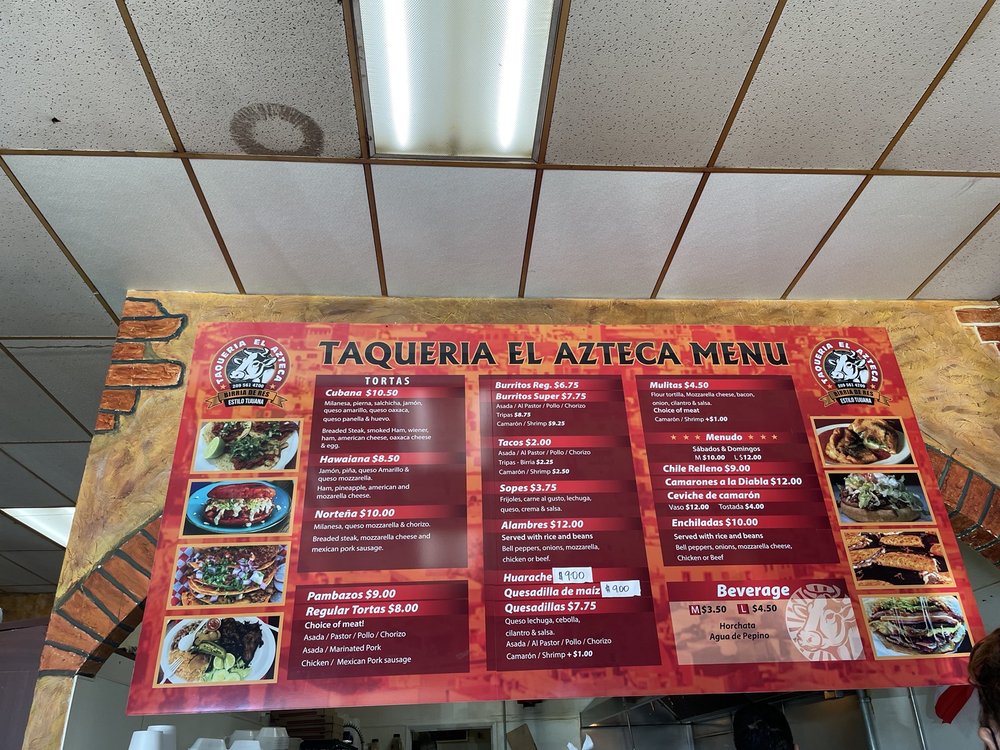 Don't miss the chance to explore transformative options like the huarache with al pastor, brimming with fresh ingredients. With convenient amenities including outdoor seating and a happy hour, Taqueria El Azteca invites you to indulge in a warm and welcoming atmosphere that celebrates the richness of Mexican cuisine.